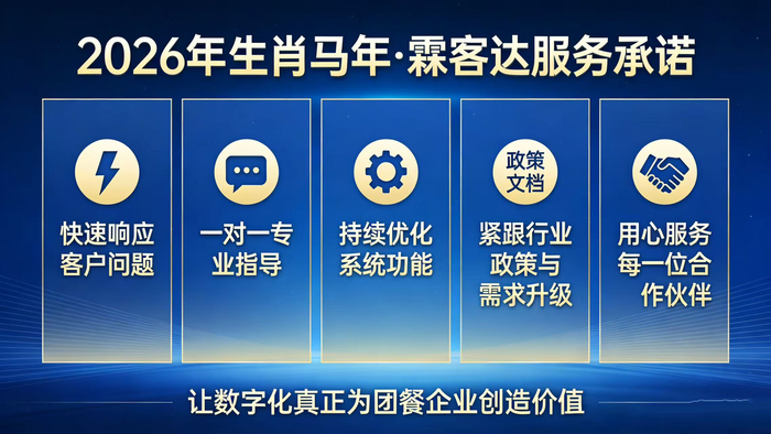 2026同心同行,共赢团餐新未来 新征程,新目标,新作为 霖客达将继续以数智化工具为引擎,以专业服务为支撑,助力更多团餐企业降本增效、提质扩容,在校园、企业、机关、医院等食堂场景中稳步发展。 2026,让我们同心同行,食力全开,共赢未来! |